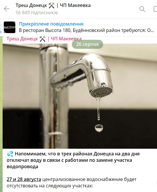 27 і 28 серпня централізоване водопостачання буде відсутнє на таких ділянках: