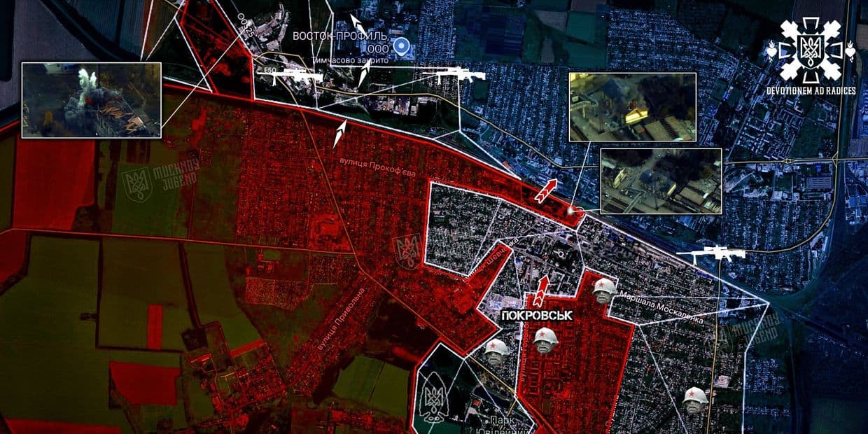 "Саме того укріпленого вузла, за який зараз точиться боротьба на виснаження. Якщо ворог закріпиться там повністю, утримати місто буде набагато складніше. Також підтверджується активність окупантів у промзоні! Кадри показують, що вони засіли у виробничих корпусах і використовують їх як опорні точки. Тим часом триває тиск у районі залізничної станції та привокзального ринку, ворог намагається відрізати наші сили, закрити коридор і замкнути кільце навколо центральної частини Покровська. Також н.п. Чунишине вже повністю під контролем противника, що створює додатковий тиск на наше праве крило оборони. Обстановка напружена, лінія фронту рухлива, ворог намагається задавити місто вогнем і вийти на домінуючі позиції!"