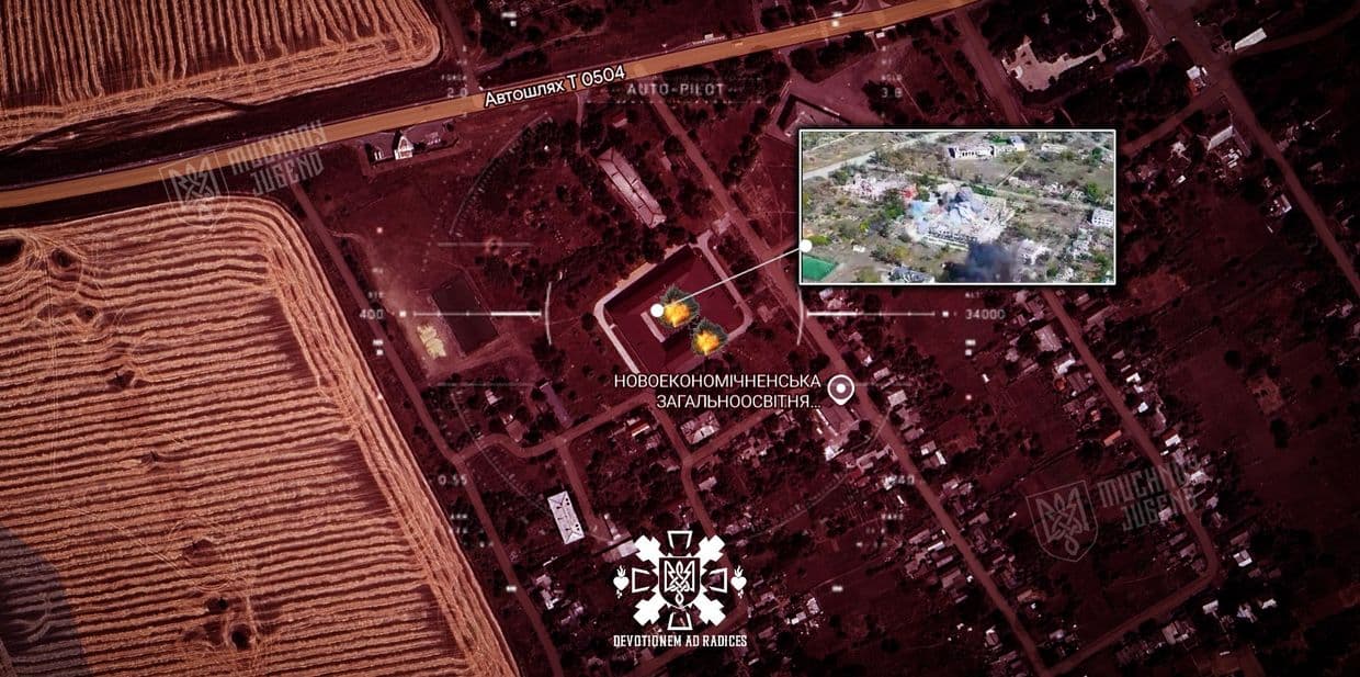 У районі Новоекономічного, українські захисники влучно відпрацювали по укриттю окупантів. Судячи з масштабів будівлі, де ховалися орки, всередині їх було чимало — кількість втрат ще уточнюється.