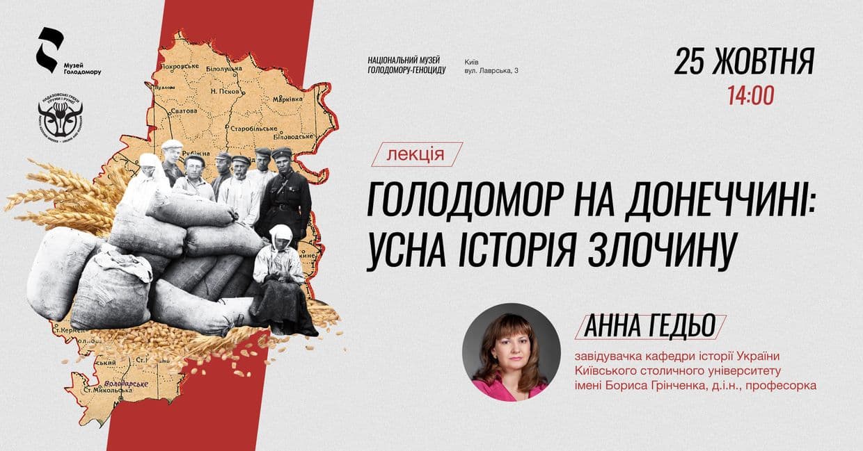 У суботу, 25 жовтня, у Залі пам’яті Національного музею Голодомору-геноциду відбудеться лекція "Голодомор на Донеччині: усна історія злочину" від докторки історичних наук, професорки, завідувачки кафедри історії України Київського столичного університету ім. Бориса Грінченка Анни Гедьо, в якій вона розкриє механізм вчинення злочину геноциду крізь призму мікроісторії — через аналіз спогадів мешканців Донеччини.