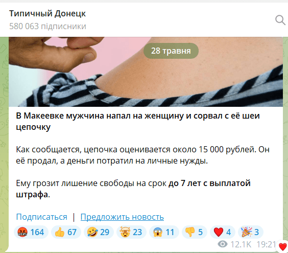 В окупованій Макіївці чоловік напав на жінку і зірвав з її шиї ланцюжок.