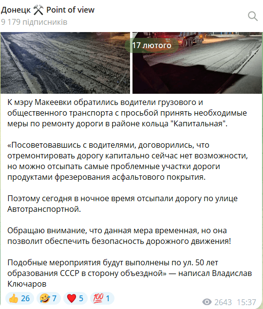 До невизнаного "мера" Макіївки, учасника НЗФ звернулися водії вантажного та громадського транспорту з проханням вжити необхідних заходів щодо ремонту дороги в районі кільця "Капітальна".