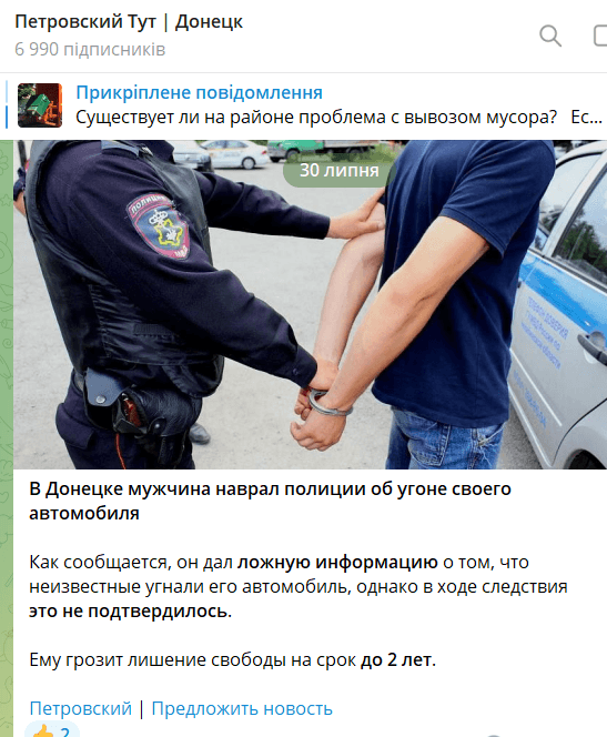 В окупованому Донецьку чоловік набрехав силовикам про викрадення свого автомобіля і отримав строк
