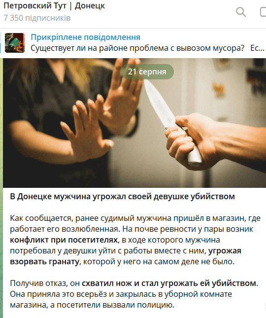 В окупованому Донецьку чоловік з ножем погрожував підірвати гранатою магазин зі своєю коханою