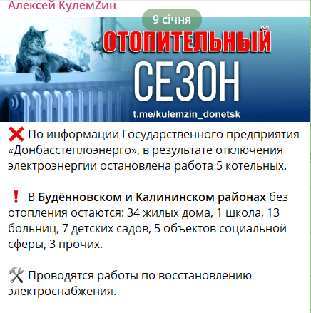 За інформацією невизнаного "підприємства" "Донбасстеплоенерго", внаслідок відключення електроенергії в окупованому Донецьку було зупинено роботу 5 котелень.