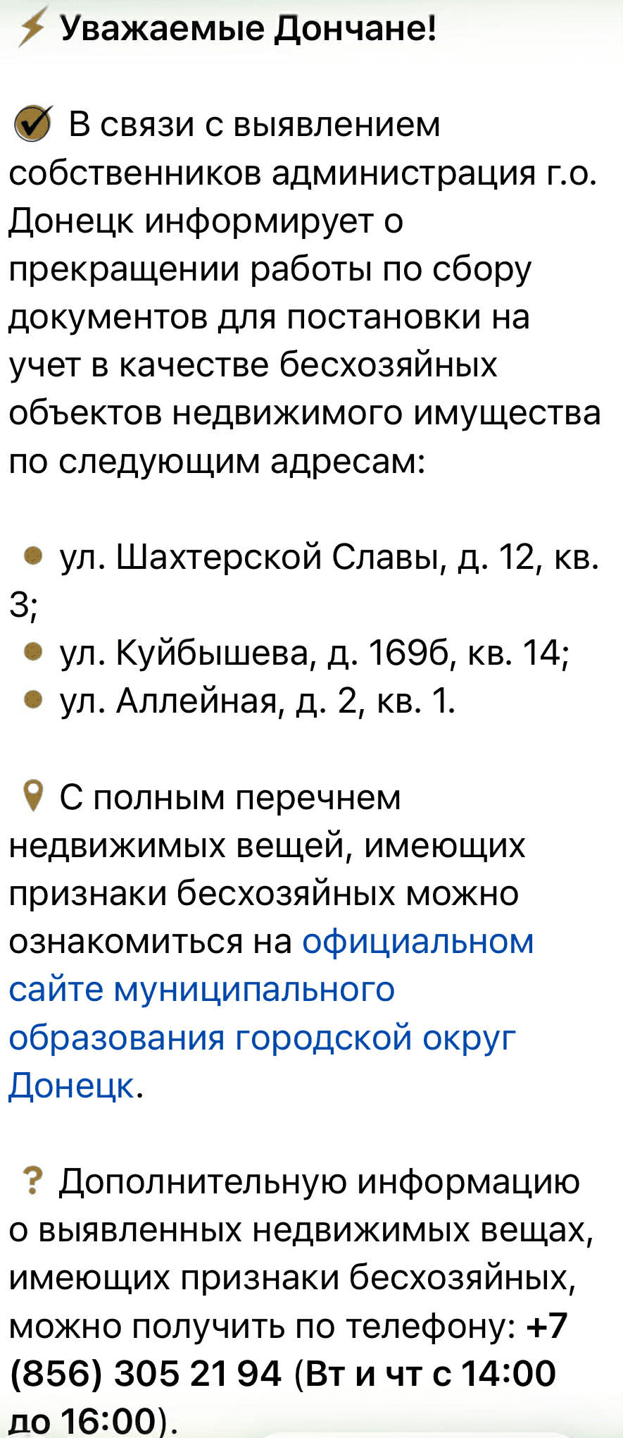 "У зв’язку з виявленням власників адміністрація у Донецьку повідомляє про припинення збору документів для взяття на облік як безгосподарних об’єктів нерухомого майна за такими адресами: