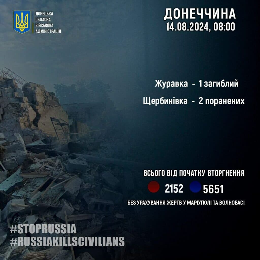 "За 13 серпня росіяни вбили 1 жителя Донеччини — у Журавці. Ще 2 людини в області за добу дістали поранення. Загальна кількість жертв росіян на Донеччині подана без урахування Маріуполя та Волновахи", — йдеться у повідомленні.