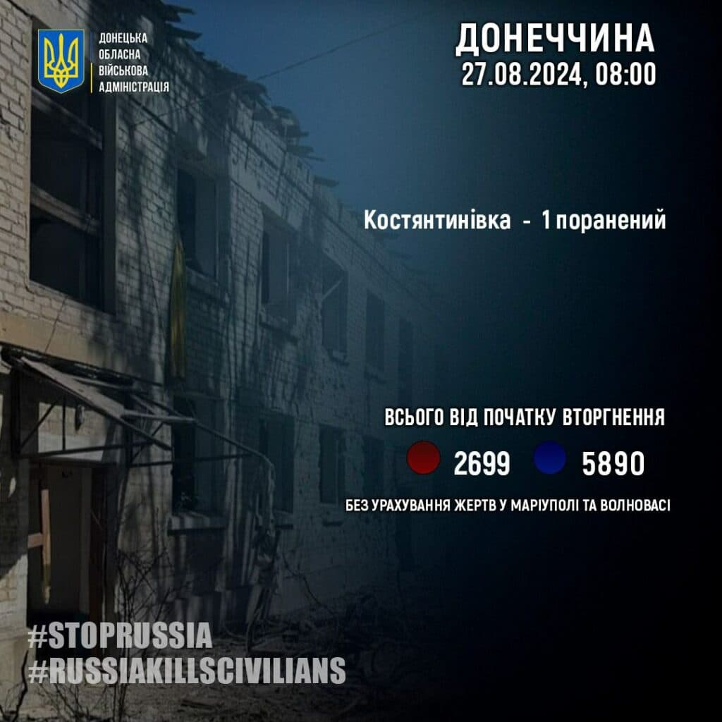 "За 26 серпня росіяни поранили 1 жителя Донеччини — у Костянтинівці. Загальна кількість жертв росіян на Донеччині подана без урахування Маріуполя та Волновахи", — йдеться у повідомленні.