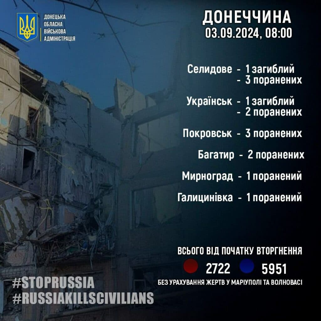 "За 2 вересня росіяни вбили 2 жителів Донеччини: у Селидовому і Українську. Ще 12 людей в області за добу дістали поранення. Загальна кількість жертв росіян на Донеччині подана без урахування Маріуполя та Волновахи", — йдеться у повідомленні.