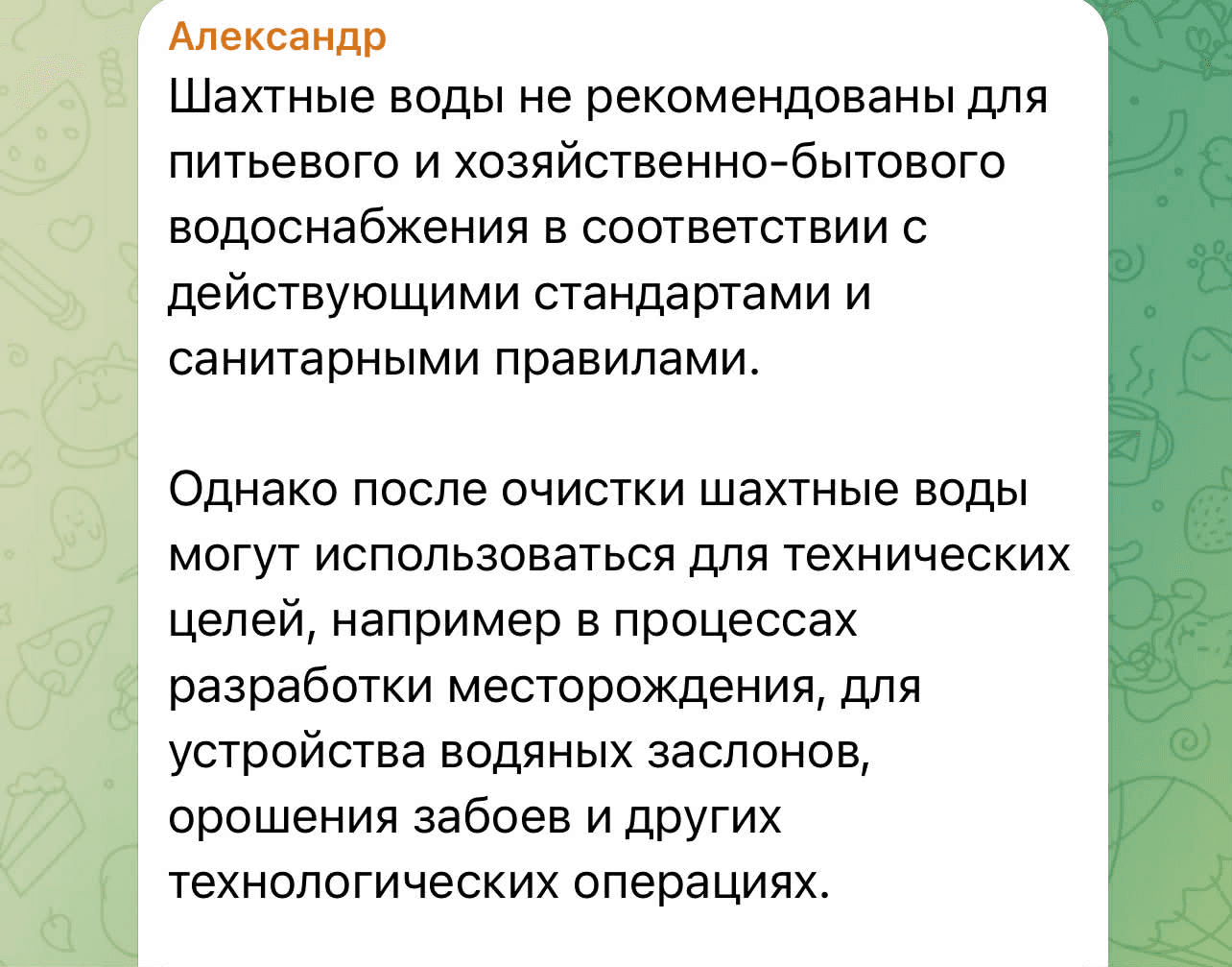Також повідомляється, що "варіант з використанням шахтних вод ускладнюється тим, що для їх очищення потрібна інша система, ніж та, що використовується при централізованому водопостачанні" в так званій "днр".