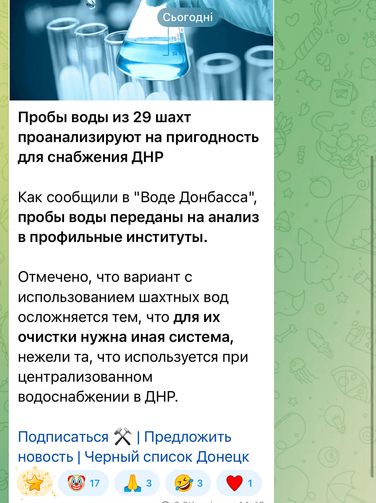 "Проби води з 29 шахт проаналізують на придатність для постачання "днр", проби води передано на аналіз у профільні інститути", — йдеться у повідомленні.