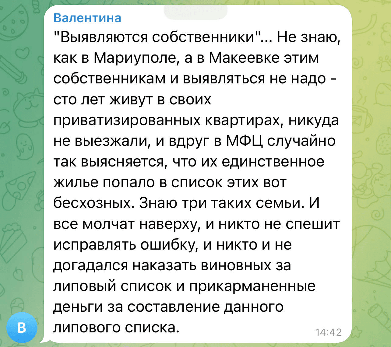 При цьому окупант зазначив, що "частина квартир "відсівається" під час перевірки, оскільки виявляються власники".
