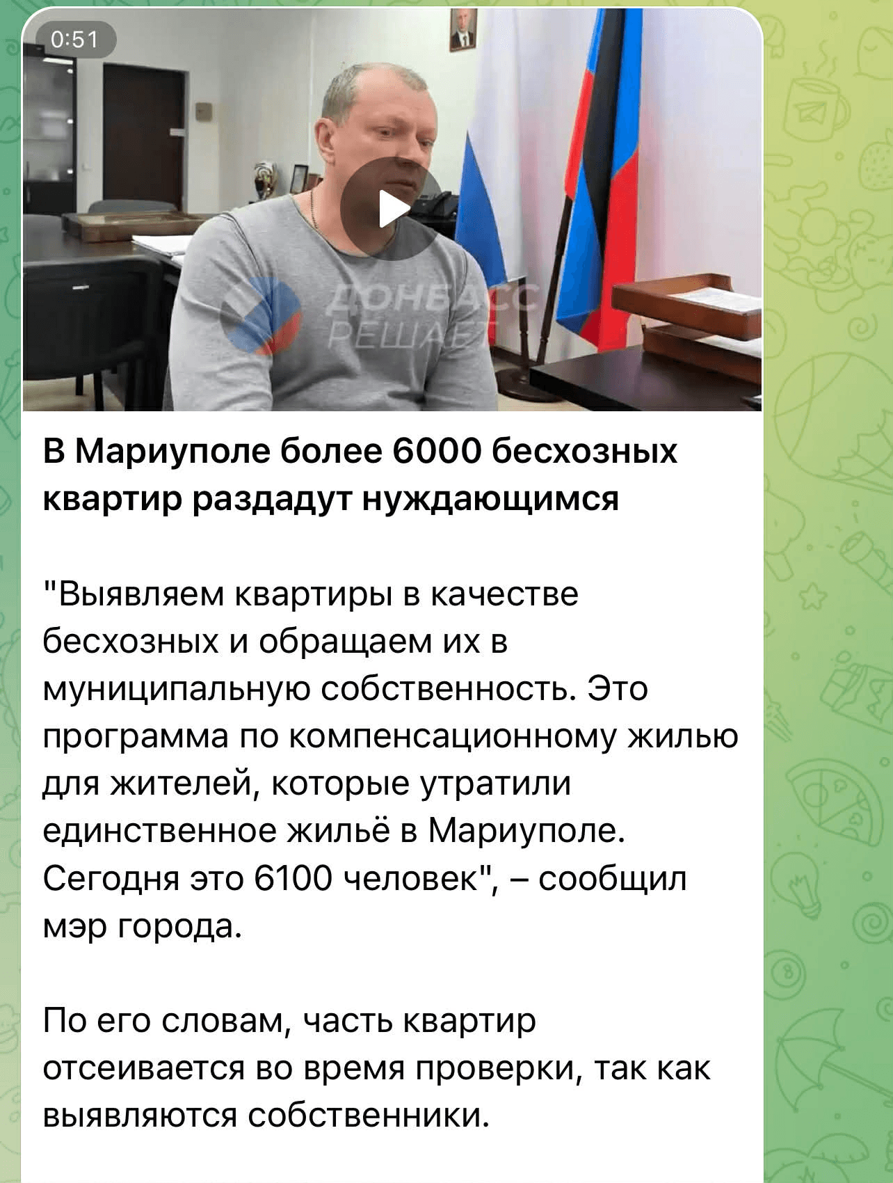"Виявляємо квартири як безхазяйні та переводимо їх у муніципальну власність. Це програма з компенсаційного житла для мешканців, які втратили єдине житло в Маріуполі. Сьогодні це 6100 осіб", — заявив ватажок окупантів і так званий "мер Маріуполя" від окупантів Антон Кольцов.