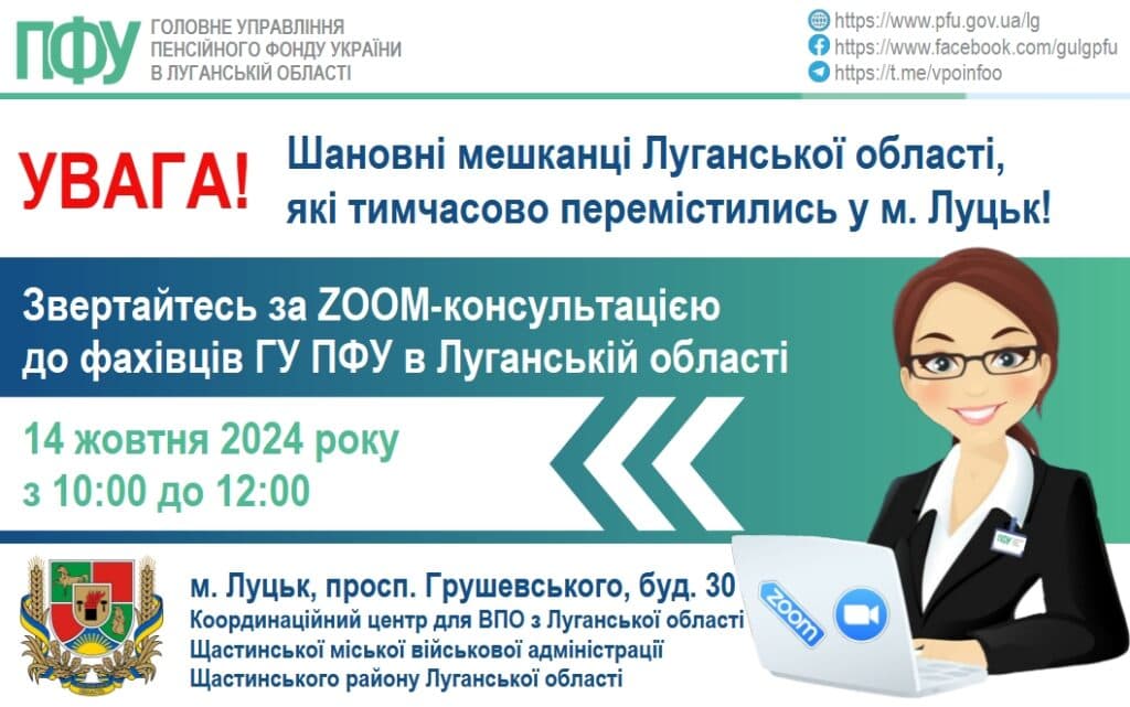 "14 жовтня у хабі Щастинської громади з 10:00 до 12:00 відбудеться онлайн-консультування з пенсійних питань від фахівця Головного управління Пенсійного фонду України в Луганській області", — йдеться у дописі.