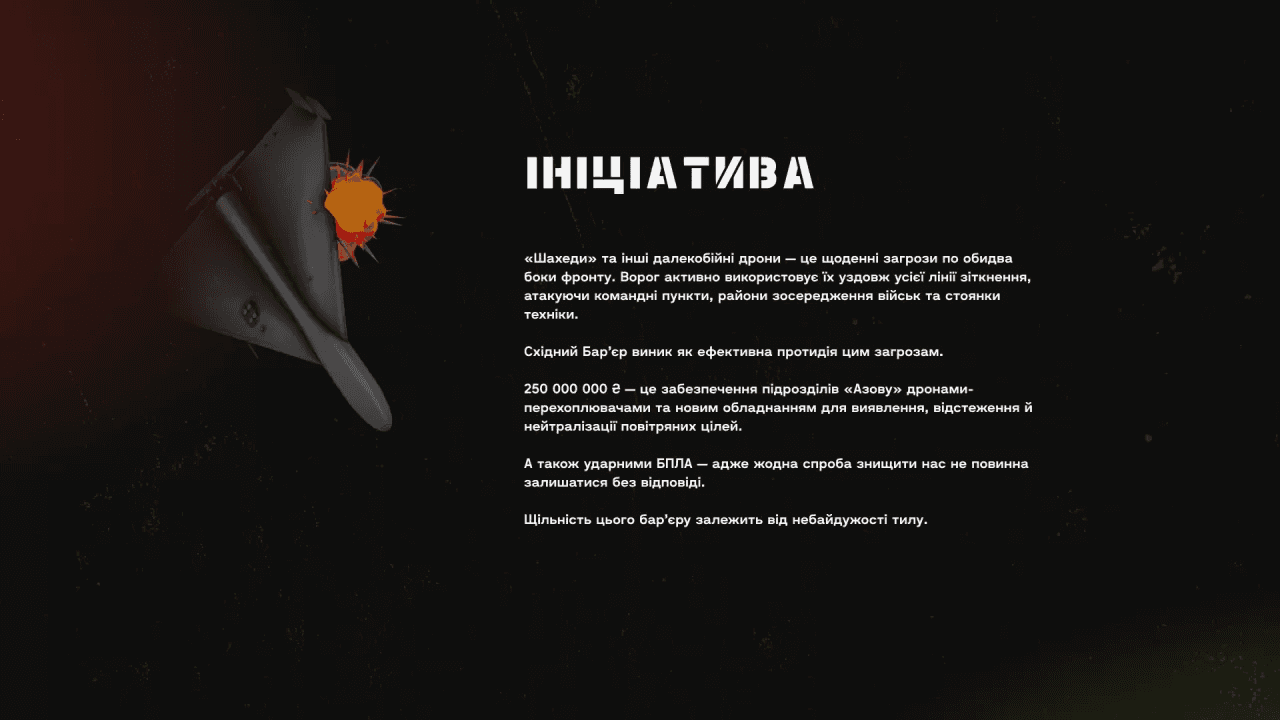 Чим унікальний збір Східний Бар'єр від AZOV.ONE та на що вони збирають 250 млн грн. Обирайте свій формат підтримки і ставайте частиною єдиної мети.