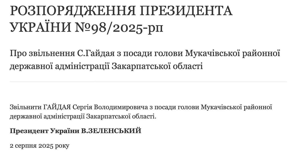 Президент звільнив Сергія Гайдая з посади голови Мукачівської РДА. Раніше Сергій Гайдав обіймав посаду голови Луганської ОВА.
